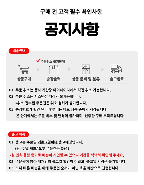 · 배송은 입금확인된 날짜로부터 1~3일 소요되며 최대 7일 이내 출고됩니다. (공휴일, 기상악화 등 불가피한 상황에 따라 추가 지연될 수 있습니다.)